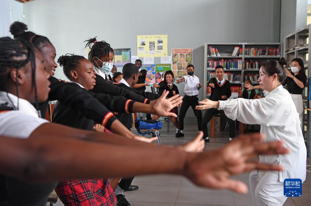 在納米比亞首都溫得和克的毛澤東主席中學(xué)3日的中文課上,第十四批中國援納醫療隊用銀針、火罐作教具,以推拿、做操為內容,讓同學(xué)們在輕松愉悅的學(xué)習中體驗中國傳統醫學(xué)文化。