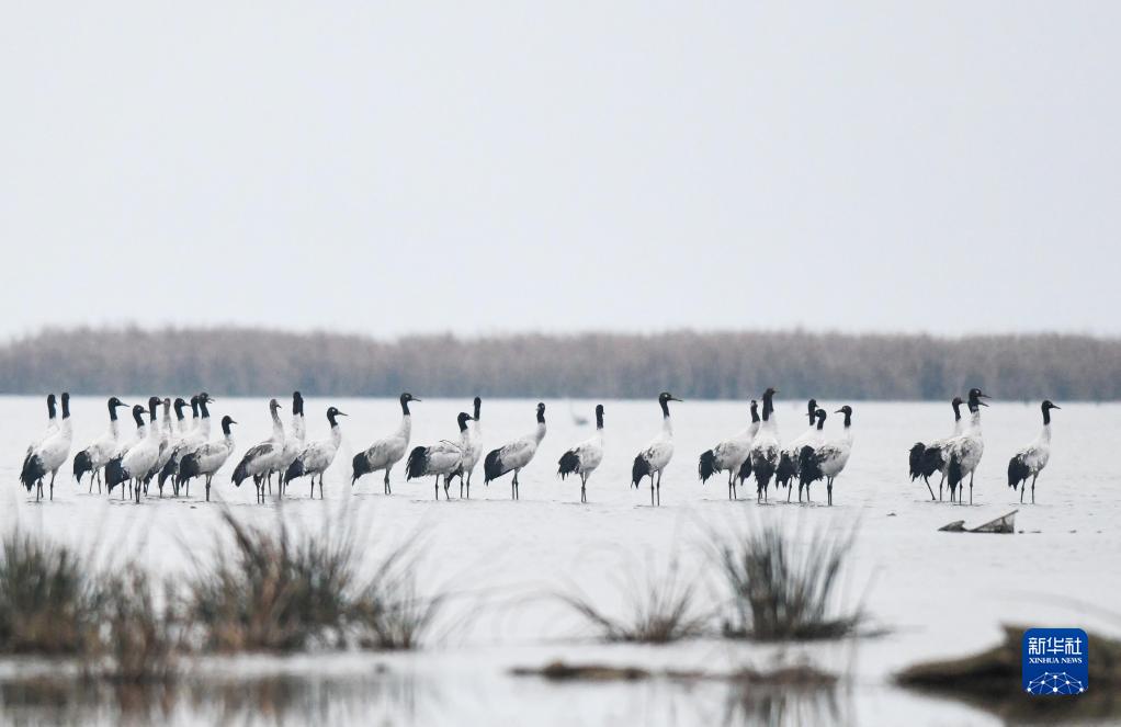 11月4日拍攝的在貴州草海棲息的國家一級保護動(dòng)物黑頸鶴。