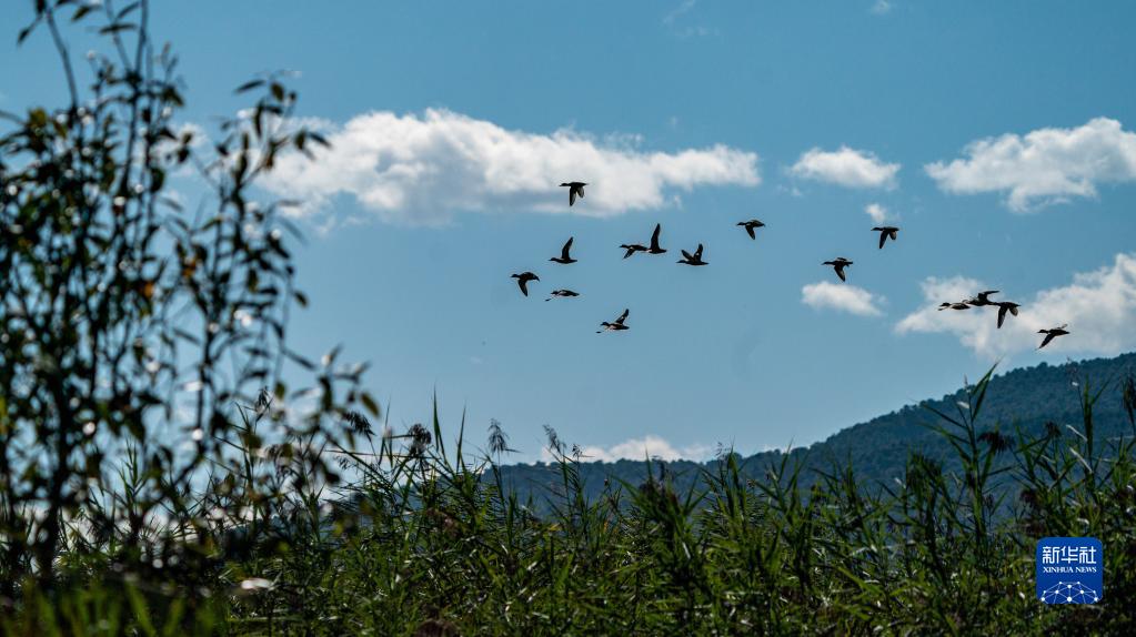 一群野鴨飛過(guò)西湖國家濕地公園(10月28日攝)。