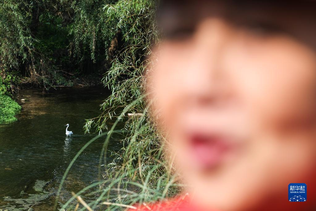 11月4日,在貴州貴陽(yáng),周余慶在花溪國家城市濕地公園內巡河,她身后一只白鷺在濕地里棲息。