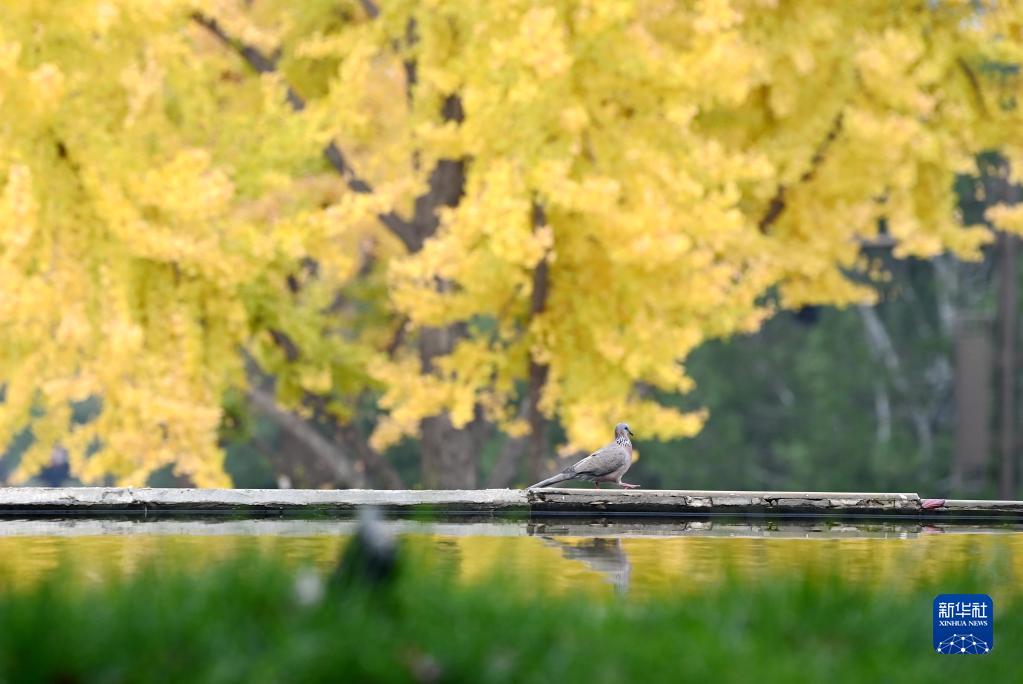 11月4日,一只斑鳩在西安市大雁塔北廣場(chǎng)的水池邊漫步。