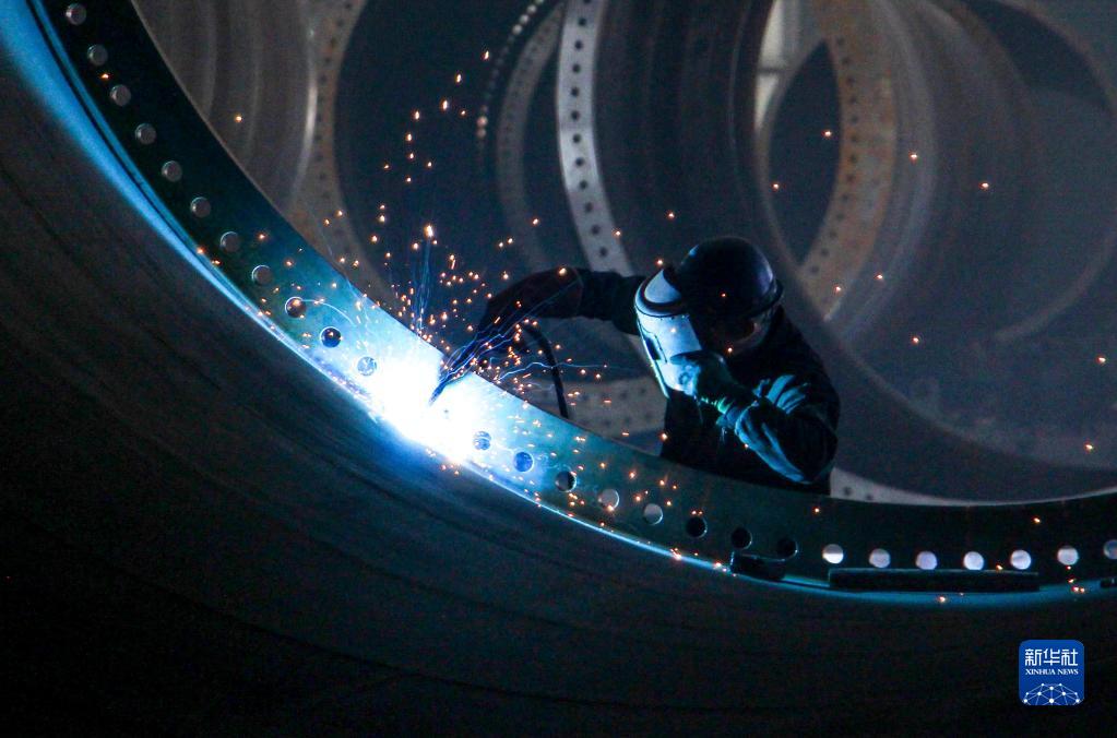 11月4日,在內蒙古通遼市天順風(fēng)電設備有限公司廠(chǎng)房,工人在生產(chǎn)線(xiàn)上工作。