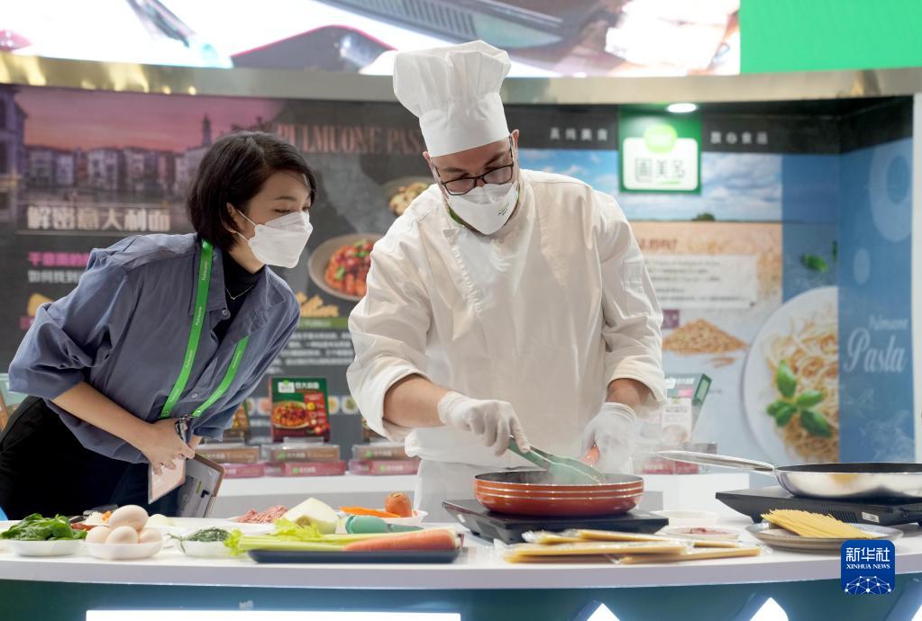 11月5日,工作人員在第五屆進(jìn)博會(huì )食品及農產(chǎn)品展區現場(chǎng)烹制意大利面。