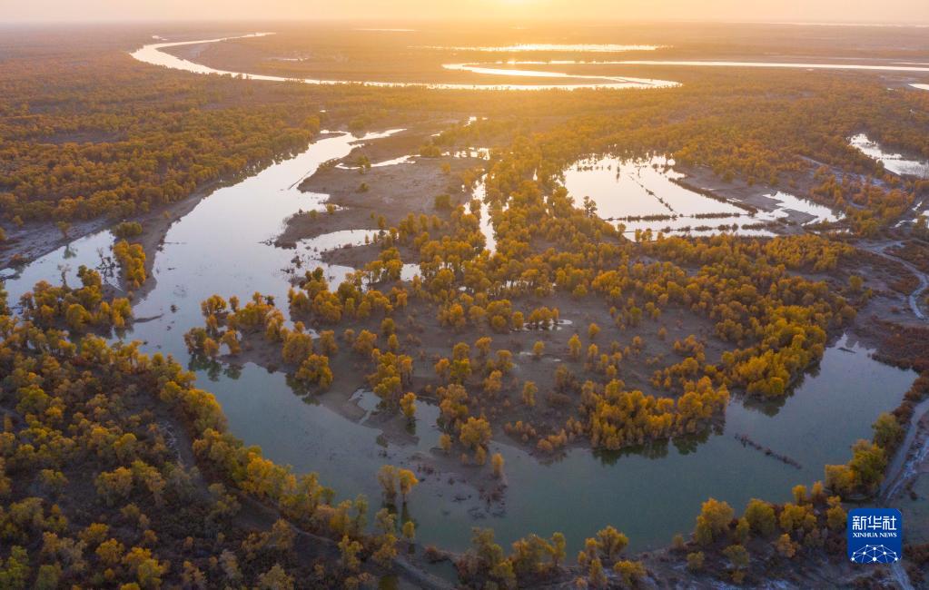 新疆塔里木河及河畔濕地胡楊林秋景(2020年10月22日攝,無(wú)人機照片)。