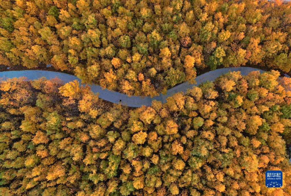 11月4日,市民在山東省威海市羊亭河濕地公園觀(guān)賞秋葉(無(wú)人機照片)。 新華社發(fā)(朱春曉 攝)
