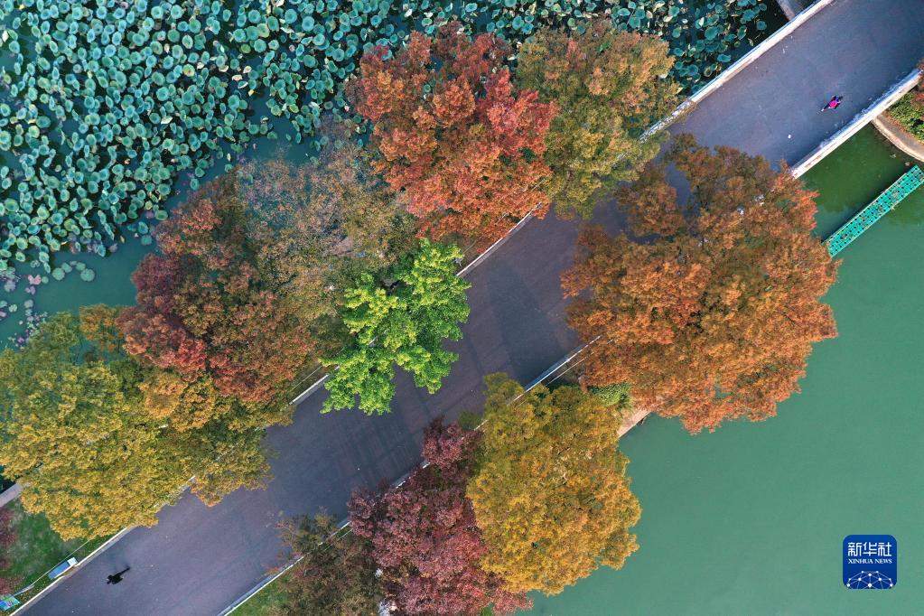11月2日,市民在江蘇省南京市玄武湖公園長(cháng)堤上賞秋健身(無(wú)人機照片)。 新華社發(fā)(楊素平 攝)