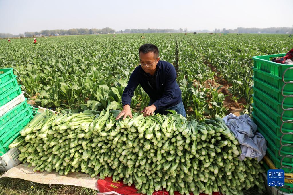 11月5日,在河南省許昌市建安區榆林鄉的蔬菜基地,菜農在采收蔬菜。