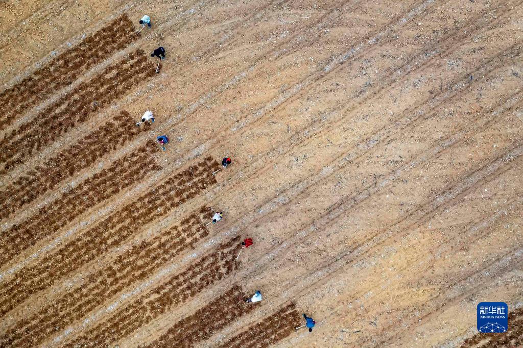 11月5日,村民在貴州省黔西市杜鵑街道岔白社區為移栽萵筍苗起窩(無(wú)人機照片)。