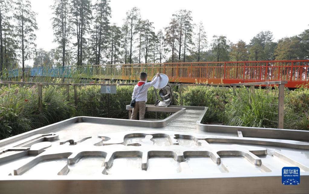 11月5日,小朋友在武漢華僑城生態(tài)濕地公園體驗演示水凈化原理的“阿基米德取水器”。