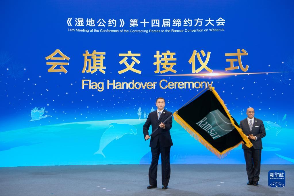 11月5日在《濕地公約》第十四屆締約方大會(huì )開(kāi)幕式上拍攝的會(huì )旗交接儀式。