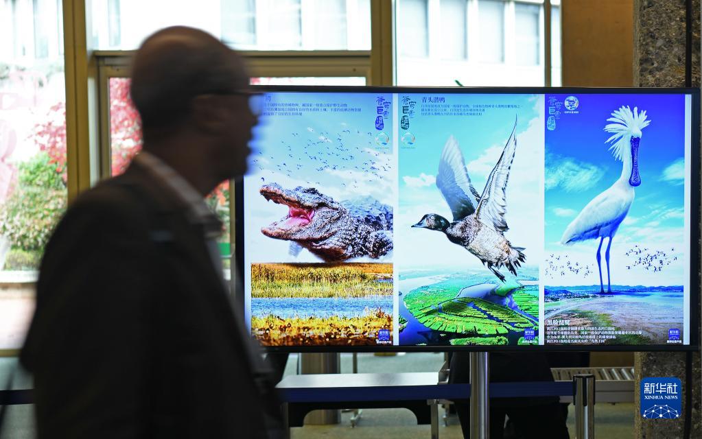 11月5日,在瑞士日內瓦國際會(huì )議中心,與會(huì )嘉賓走過(guò)《濕地公約》第十四屆締約方大會(huì )日內瓦會(huì )場(chǎng)中國展區。