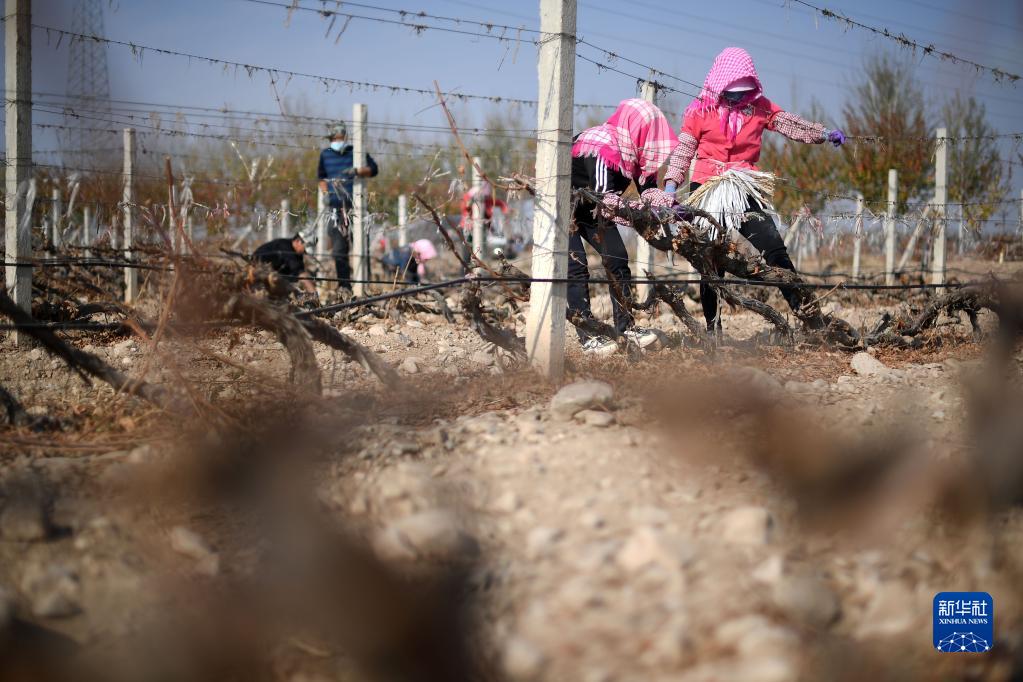 11月5日,在位于寧夏銀川市賀蘭山東麓的藍賽酒莊,農民進(jìn)行埋藤作業(yè)。