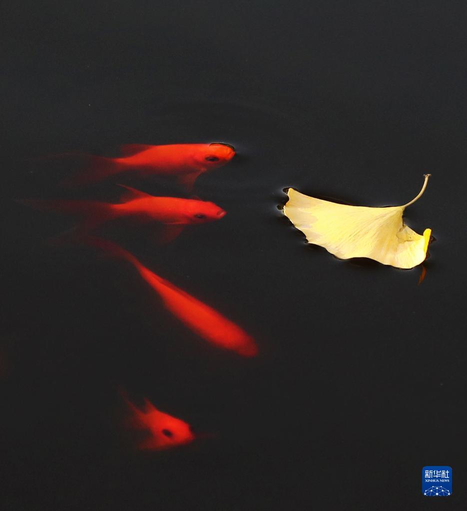 10月27日,在山東省滕州市西崗鎮,一群錦鯉在銀杏葉邊游弋。
