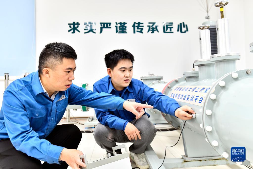 11月5日,馮新巖(左)和同事在國網(wǎng)山東省電力公司超高壓公司山東省特高壓輸變電技術(shù)與裝備重點(diǎn)實(shí)驗室工作。