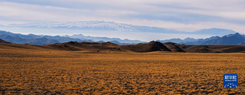 新疆裕民縣巴爾魯克山冬季牧場(chǎng),遠山覆雪,牧草秋黃(11月4日攝)。