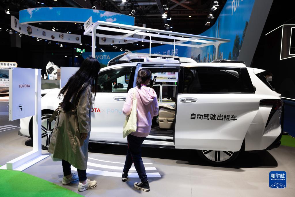 11月6日,參觀(guān)者在第五屆進(jìn)博會(huì )汽車(chē)展區參觀(guān)豐田混合動(dòng)力的自動(dòng)駕駛出租車(chē)。