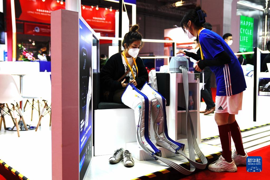 11月6日,參觀(guān)者在第五屆進(jìn)博會(huì )消費品展區體驗家用腿部按摩儀。