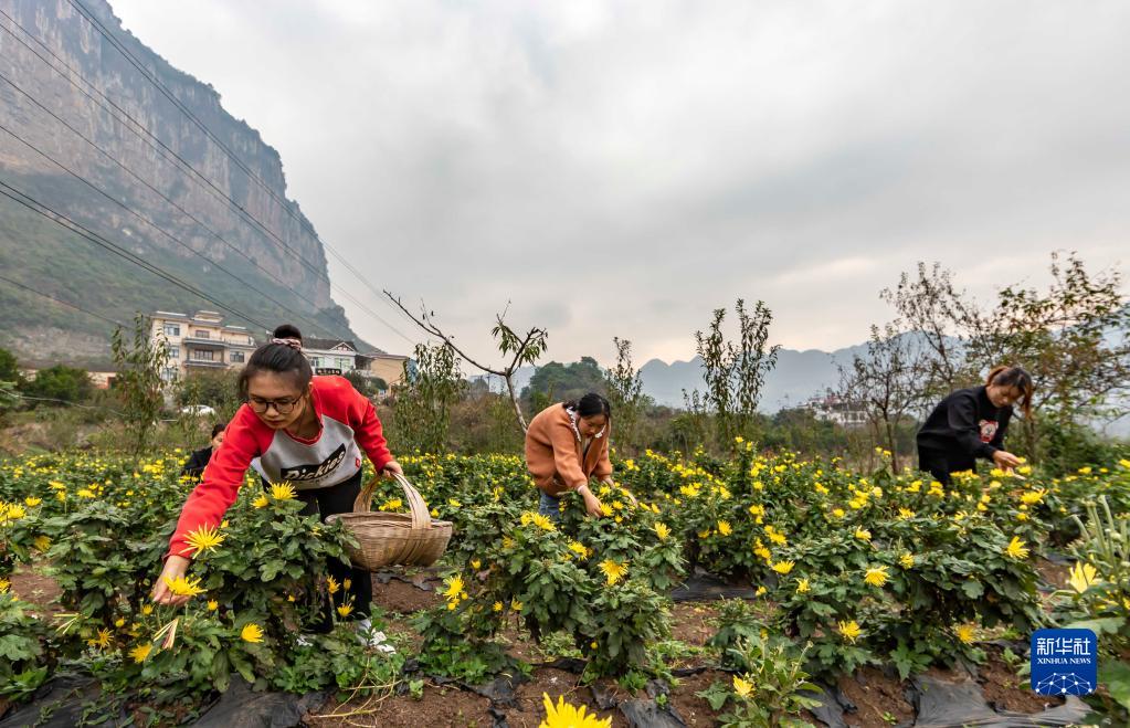 11月7日,村民在貴州省黔西市大關(guān)鎮丘林村采摘金絲皇菊。