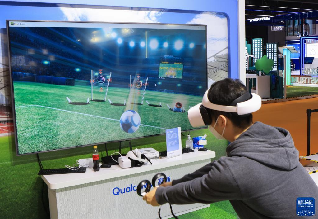 11月7日,參觀(guān)者在第五屆進(jìn)博會(huì )美國高通公司展臺參加5G無(wú)界XR賽事體驗。