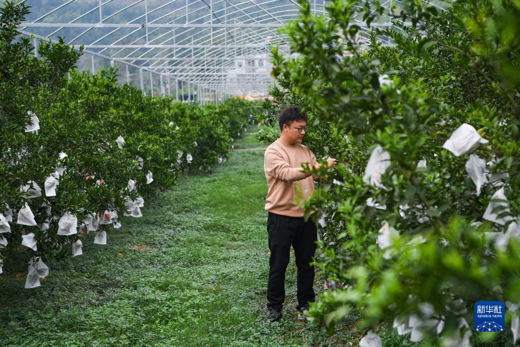 10月26日,在重慶市大足區中敖鎮加福村,劉峰鉆在柑橘園查看柑橘生長(cháng)情況。