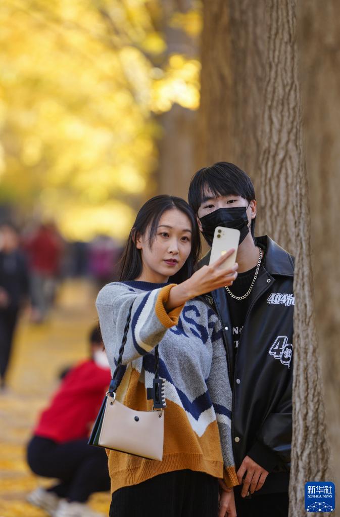 11月7日,兩位游客在北京釣魚(yú)臺國賓館旁的銀杏大道上自拍。