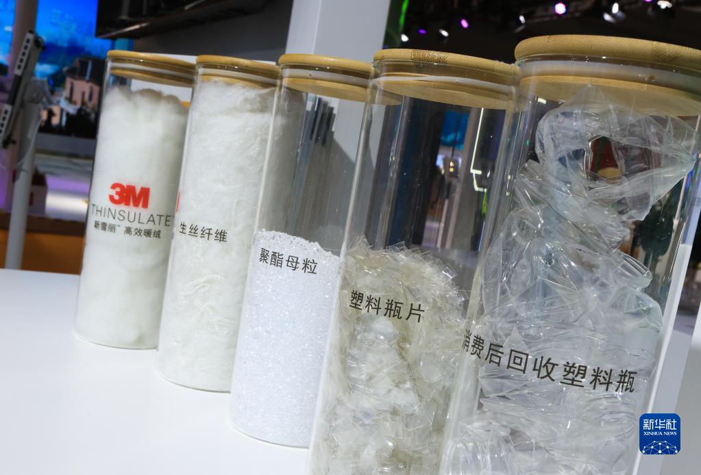 11月7日在第五屆進(jìn)博會(huì )技術(shù)裝備展區拍攝的循環(huán)再生衣物材料演示。