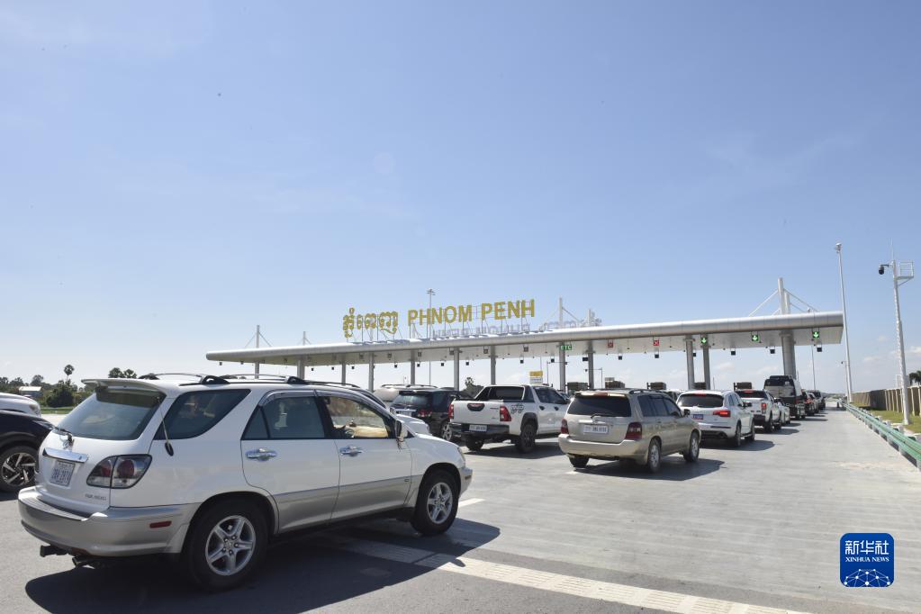11月7日,車(chē)輛在柬埔寨首都金邊的金港高速公路入口處排隊。