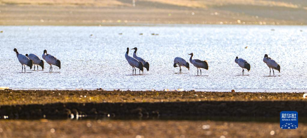 黑頸鶴在林周縣虎頭山水庫休憩(11月6日攝)。