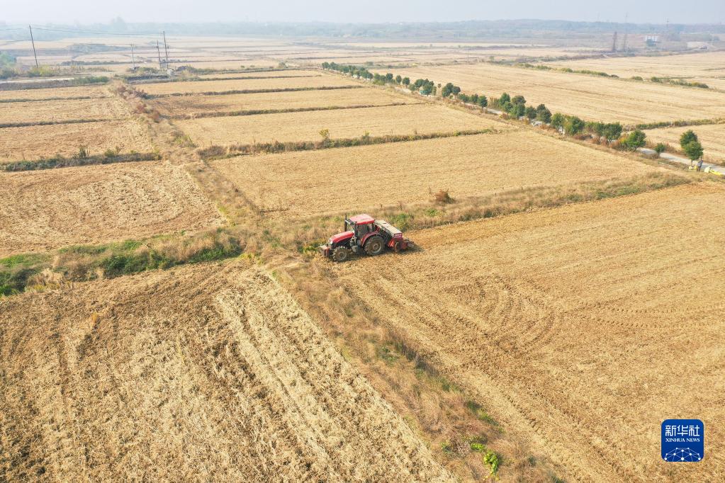 11月8日,江蘇省句容市郭莊鎮葛村村農民駕駛農機在田里播種冬小麥(無(wú)人機照片)。