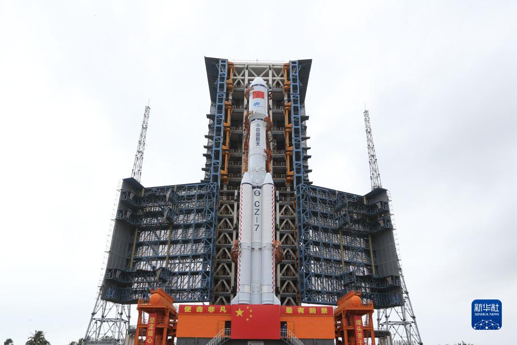 11月9日,天舟五號貨運飛船與長(cháng)征七號遙六運載火箭組合體轉運至發(fā)射塔架。