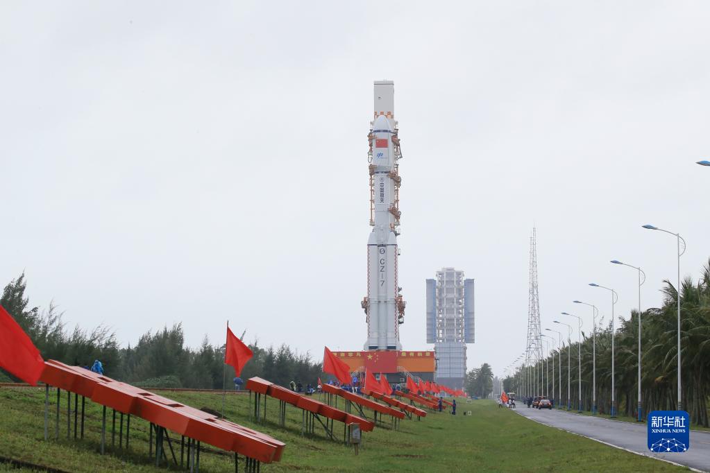 11月9日,天舟五號貨運飛船與長(cháng)征七號遙六運載火箭組合體在垂直轉運中。
