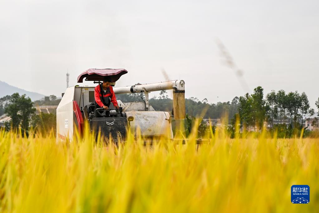 11月9日,在興業(yè)縣葵陽(yáng)鎮葵聯(lián)村,農機手駕駛收割機收獲水稻。