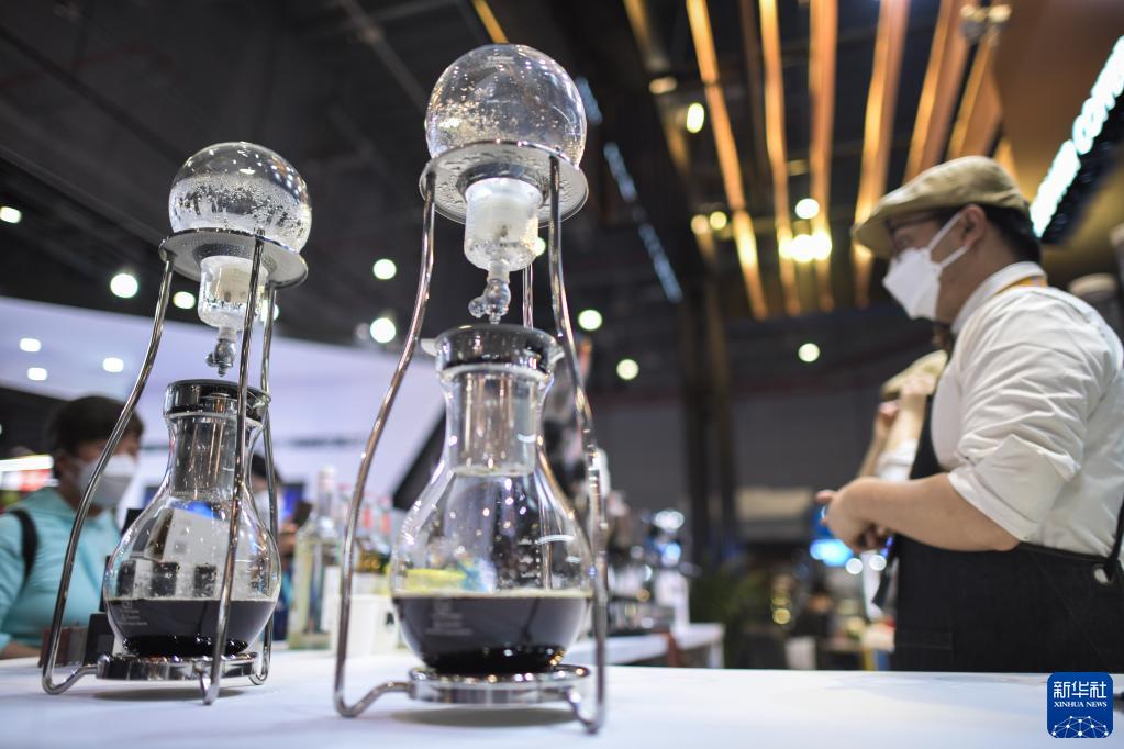 11月9日,在第五屆進(jìn)博會(huì )食品及農產(chǎn)品展區,一處展臺的工作人員在冰滴咖啡壺旁與參觀(guān)者交流。