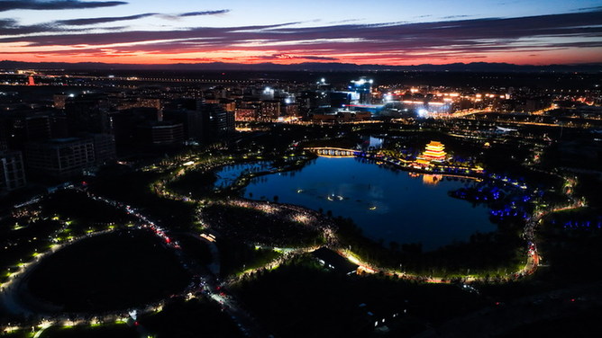 ??? 夜幕下的雄安新區金湖公園,靜謐而美好,蜿蜒的燈帶勾勒出湖形,景觀(guān)、建筑依水為景與遠處的容東片區建筑群體構成連綿起伏的城市風(fēng)景線(xiàn)。