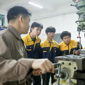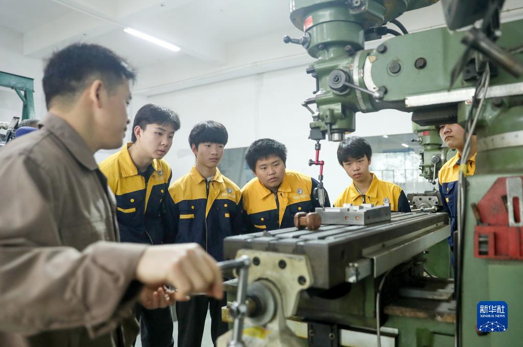 11月9日,華鎣市一家光電儀器企業(yè)技師在車(chē)間內給職業(yè)教育培訓中心的學(xué)生現場(chǎng)講解機床的操作技術(shù)。