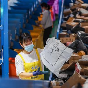 11月10日,工作人員在位于貴州省龍里縣的貴州快遞物流園一家快遞分撥中心分揀快遞。