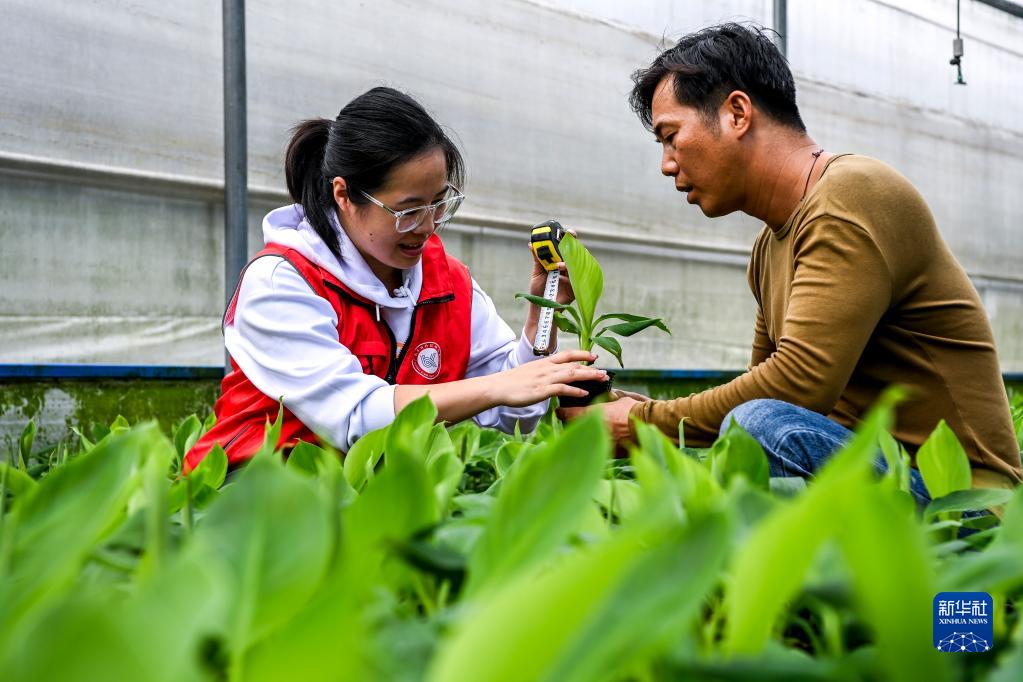 11月10日,在興業(yè)縣葵陽(yáng)鎮一個(gè)香蕉種苗繁育基地,科技特派員(左)在采集香蕉種苗的生長(cháng)數據。