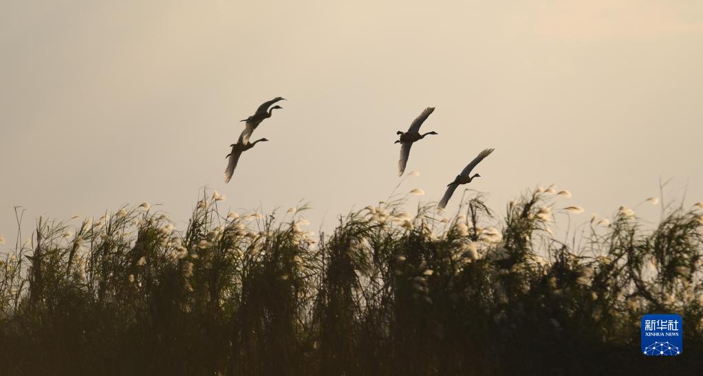 幾只天鵝在南昌市高新區的濕地上空飛翔(2020年11月18日攝)。