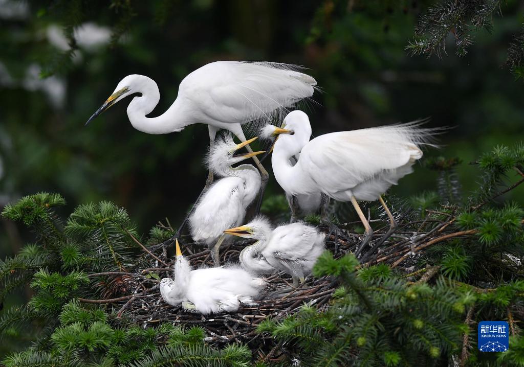 在南昌市新建區象山森林公園,白鷺在給雛鳥(niǎo)喂食(2021年5月18日攝)。