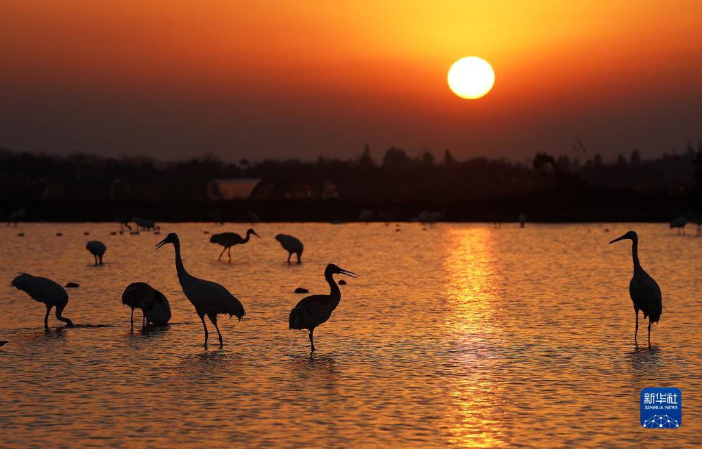 在南昌市高新區五星白鶴保護小區,白鶴等候鳥(niǎo)在濕地里棲息(2021年12月21日攝)。