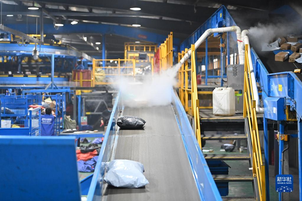 11月11日,在山西太原一家快遞企業(yè)的轉運中心,自動(dòng)化設備對包裹進(jìn)行消殺。