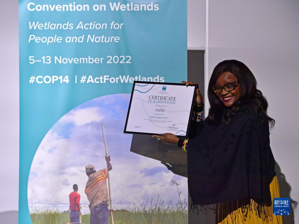 11月10日,在瑞士日內瓦,《濕地公約》秘書(shū)長(cháng)蒙巴手舉為中國安徽合肥頒發(fā)的“國際濕地城市”認證證書(shū)。