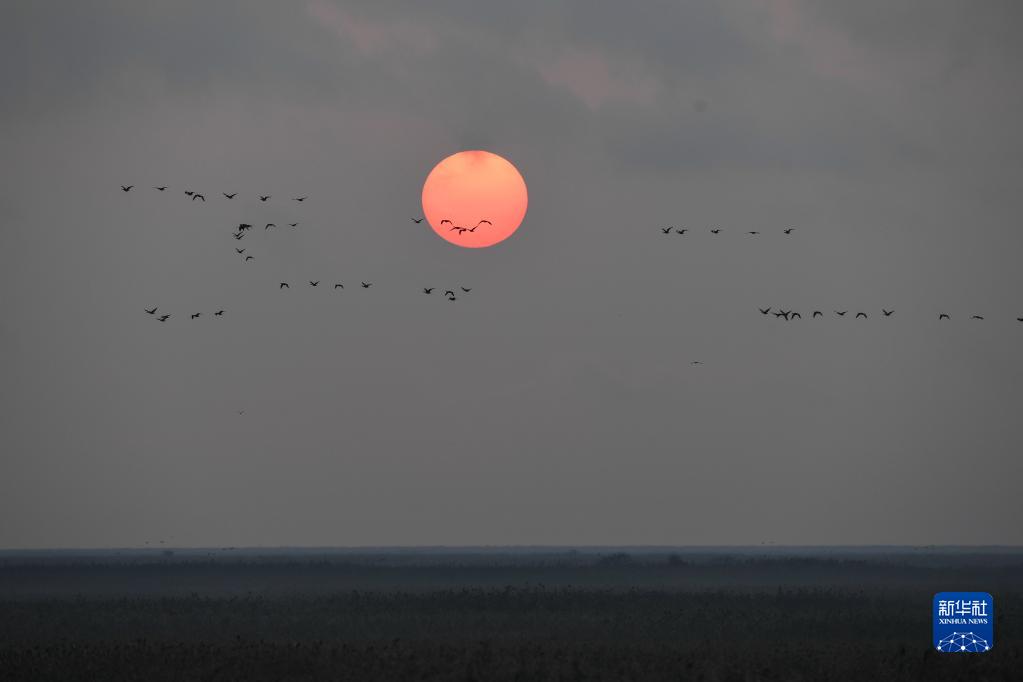 初冬清晨,紅彤彤的朝陽(yáng)從黃海邊徐徐升起,籠罩在輕紗般薄霧中的濕地醒來(lái)了。成群的丹頂鶴、灰鶴、東方白鸛等排成各自獨特的隊形,在美麗的家園自由飛翔。