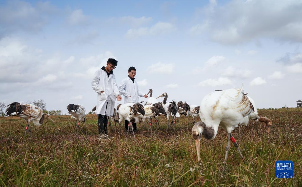 保護區馴養員姜官宏(右)、蔡新杰與人工繁育的丹頂鶴互動(dòng)(11月8日攝)。