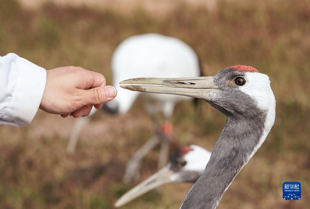 保護區馴養員與人工繁育的丹頂鶴互動(dòng)(11月8日攝)。