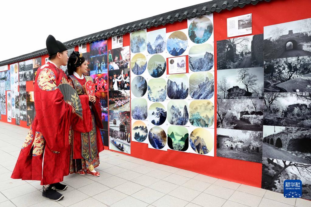 11月11日,兩位身著(zhù)漢服的舞蹈演員在淮海攝影文化周主題展上觀(guān)看展出的攝影作品。