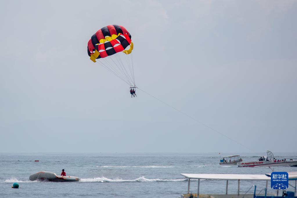 11月12日,在印度尼西亞巴厘島丹戎伯諾阿海灘,游客體驗水上帆傘運動(dòng)。巴厘島是印度尼西亞著(zhù)名的旅游勝地。新華社記者 王益亮 攝