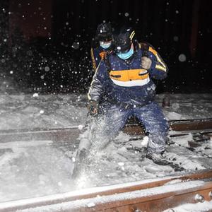 11月13日,在長(cháng)春火車(chē)站,中國鐵路沈陽(yáng)局集團有限公司長(cháng)春站工作人員清理鐵軌上的積雪。