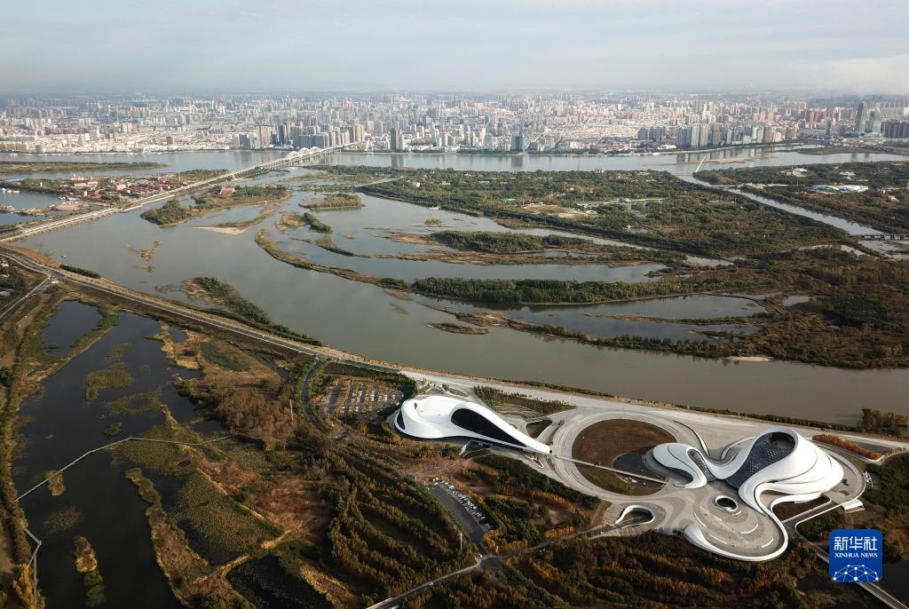 位于松花江畔的哈爾濱大劇院和附近濕地(9月26日攝,無(wú)人機照片)。