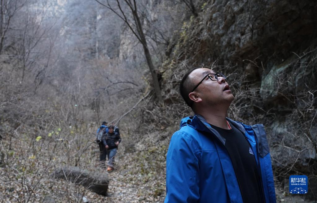趙明騰停下腳步觀(guān)察山中野生動(dòng)物的棲息環(huán)境(11月9日攝)。